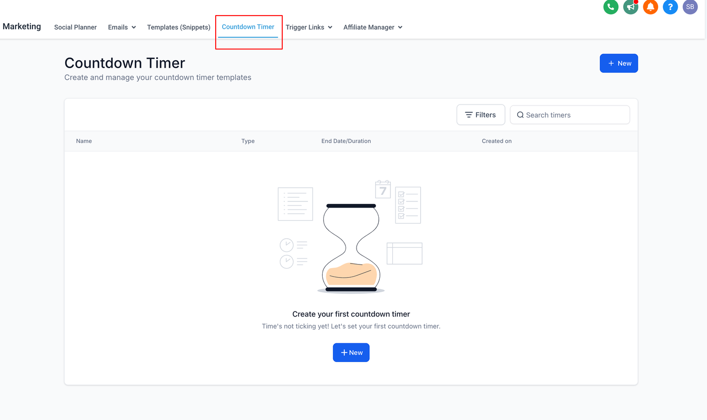 Gehe zum Bereich „Marketing“ und wähle „Countdown Timer“.