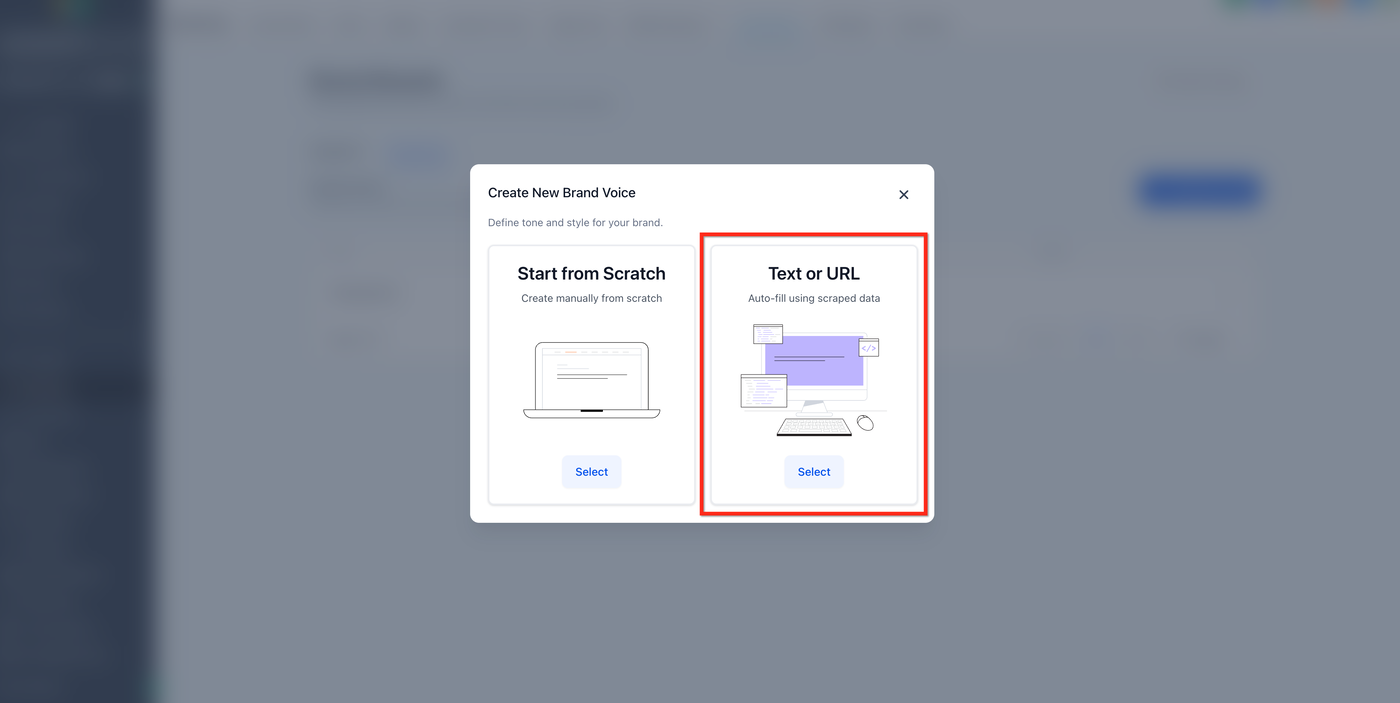 Mit der Funktion „Create with Text or URL“ kannst du innerhalb weniger Sekunden eine vollständige Brand Voice generieren – indem du entweder: