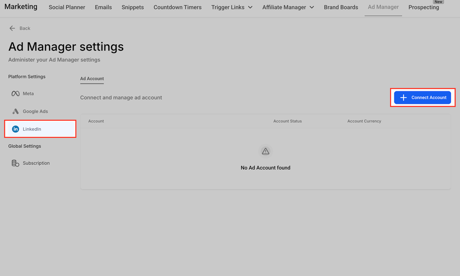 Klicken Sie auf + Connect Account, um Ihr LinkedIn-Werbekonto zu verknüpfen.