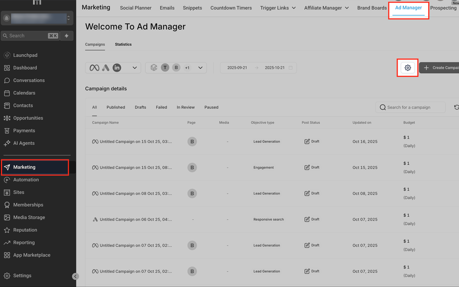 Navigieren Sie zu Marketing › Ad Manager und klicken Sie auf das Zahnradsymbol Einstellungen oben rechts im Dashboard.