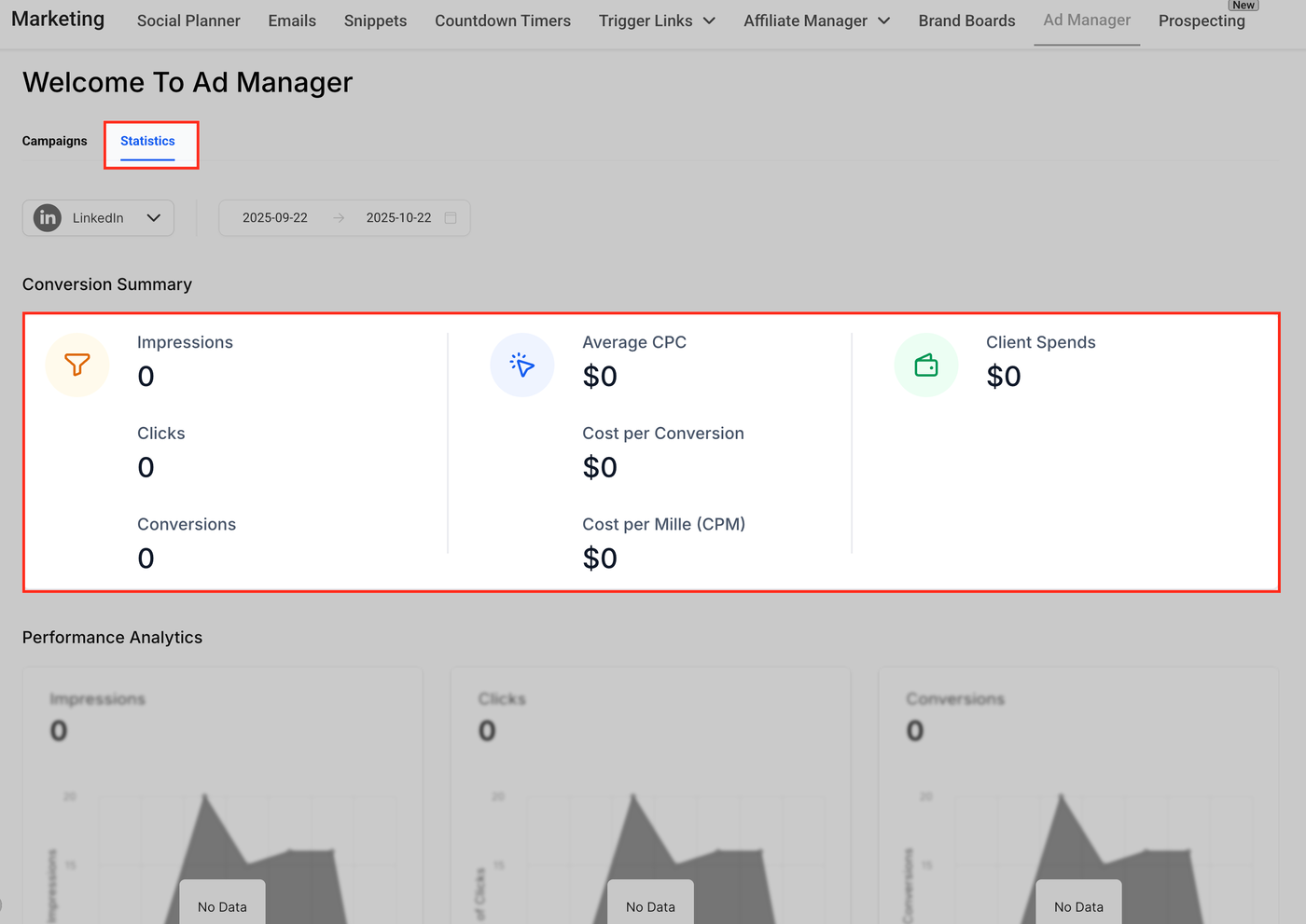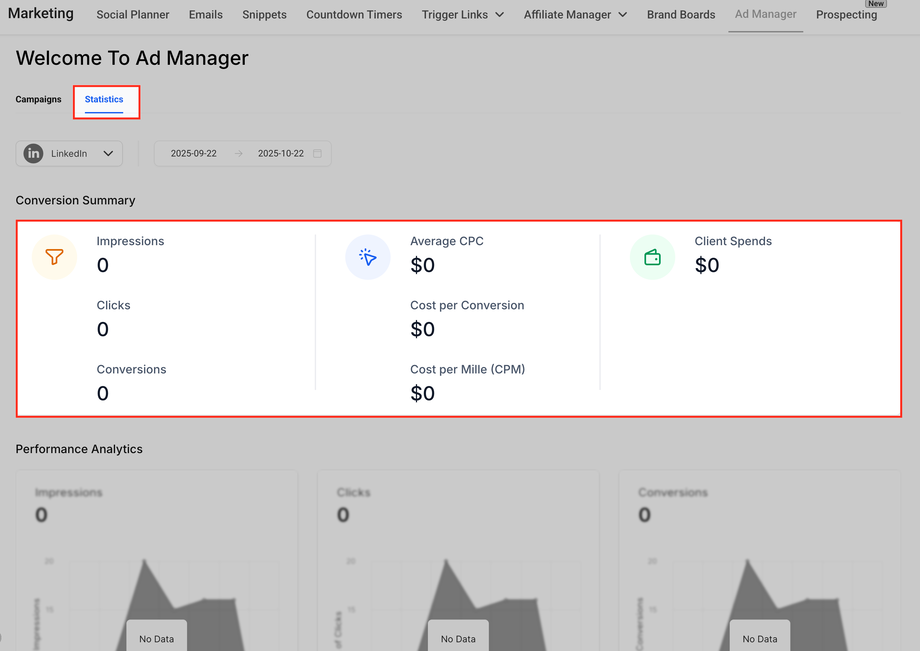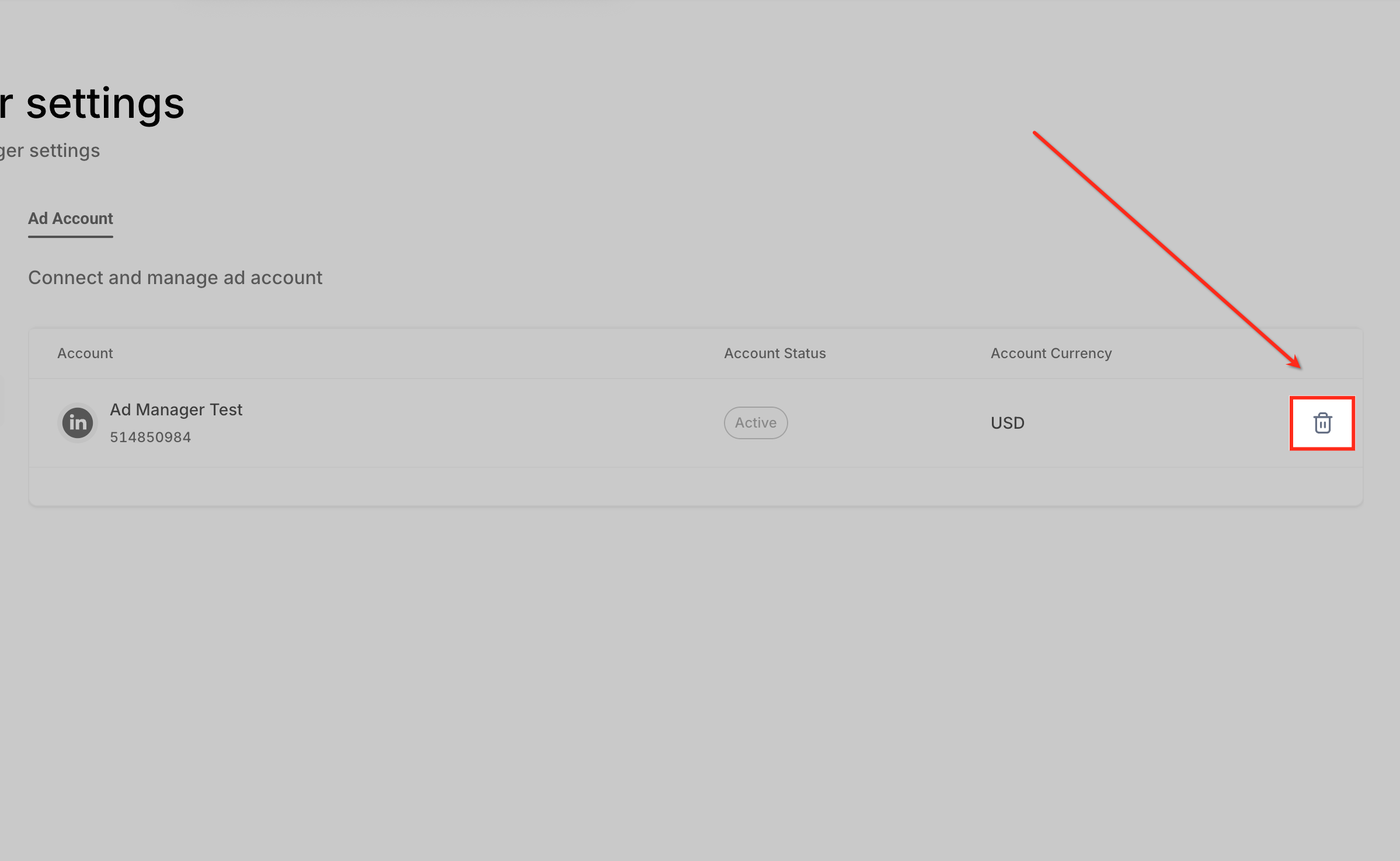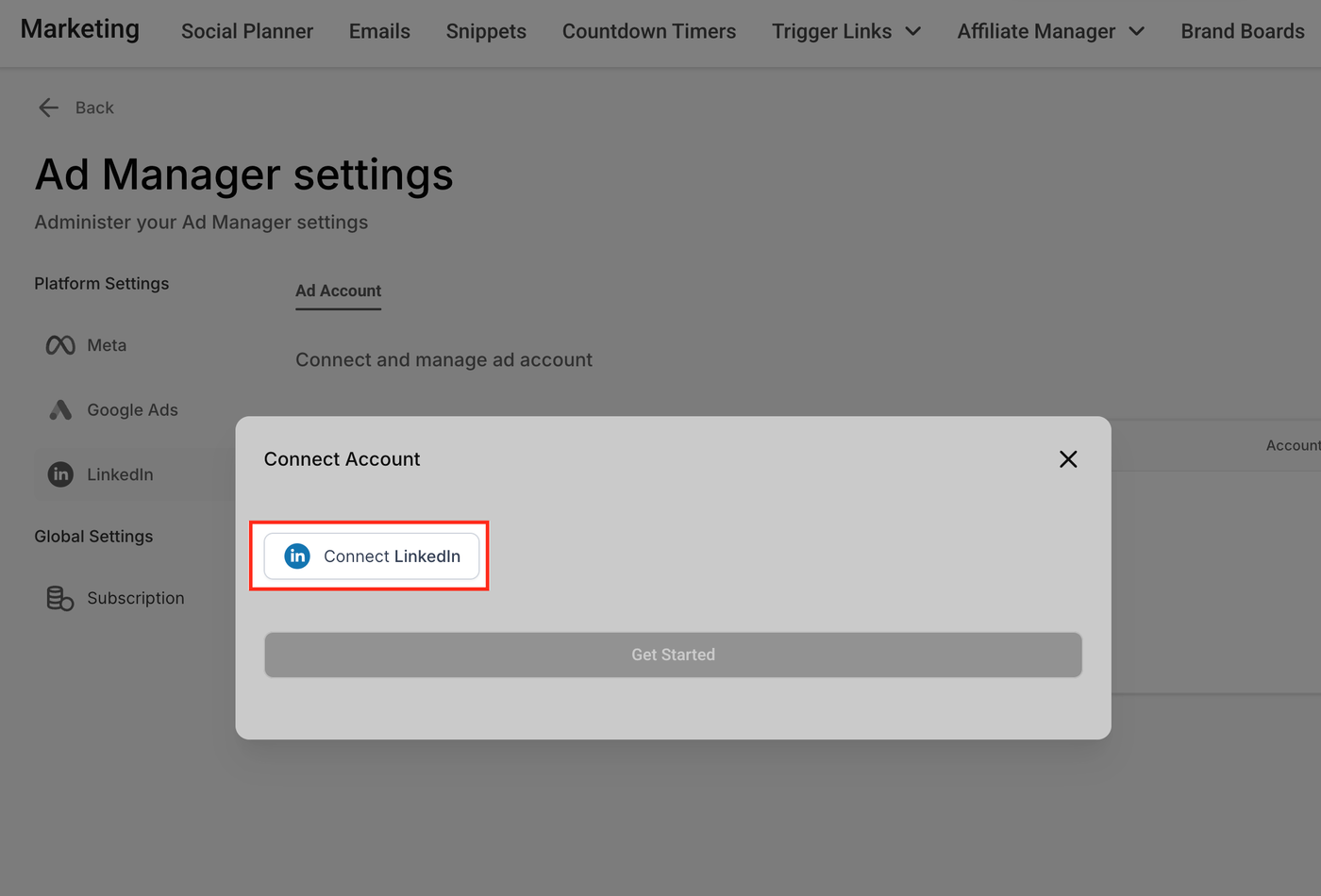 Dies öffnet die Ad Manager-Einstellungen, in denen Sie Werbekonten für Meta, Google und LinkedIn konfigurieren oder verbinden können.