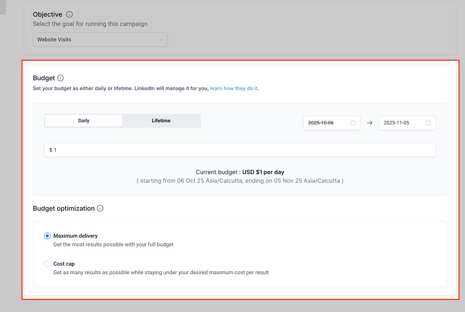 Optimierungsmodus: Maximum Delivery (Standard) oder Cost Cap
