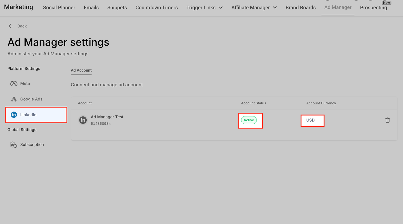 Nach erfolgreichem Login erscheint Ihr LinkedIn-Konto unter Ad Manager Settings mit grünem Active Status und der zugehörigen Währung (z. B. USD).