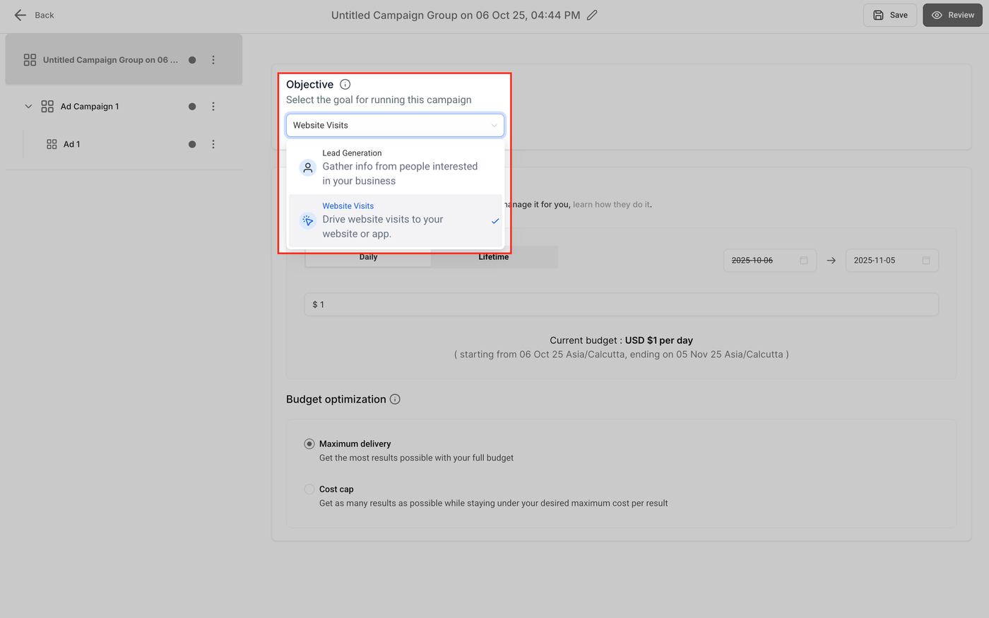Kampagnenziel wählen: Lead Generation oder Website Traffic