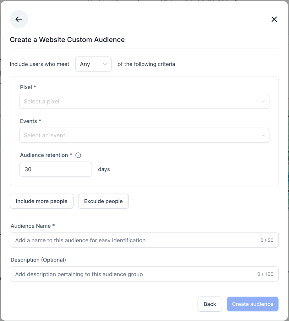 Sobald eine Quelle ausgewählt wurde und der Benutzer auf „Next“ klickt, wird er zum zweiten Schritt der Custom Audience-Erstellung weitergeleitet, und ein Dialog wird angezeigt, dessen Inhalte je nach gewählter Quelle variieren.