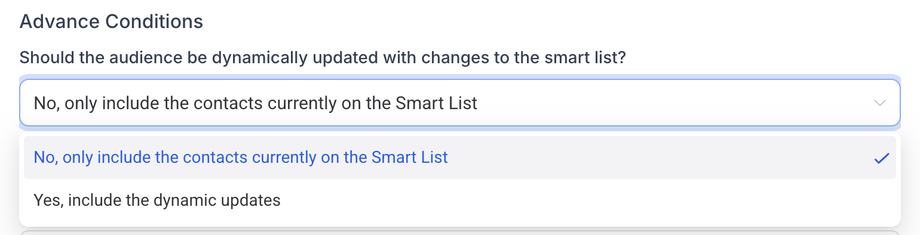 Use Smart Lists → Dynamic | Verknüpft mit einer HighLevel Smart List, die sich dynamisch aktualisiert | Fügt Kontakte automatisch hinzu oder entfernt sie, wenn sich die Smart List ändert |