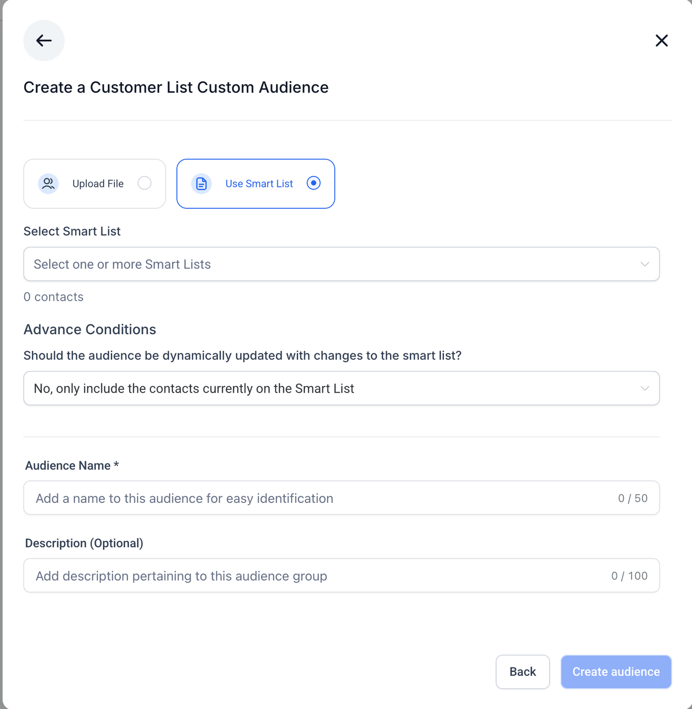 Durch Auswahl von „Customer List“ als Custom Audience-Quelle im ersten Schritt-Dialog können Benutzer CSV Upload oder Smart List wählen und im zweiten Schritt die Audience-Eigenschaften definieren.