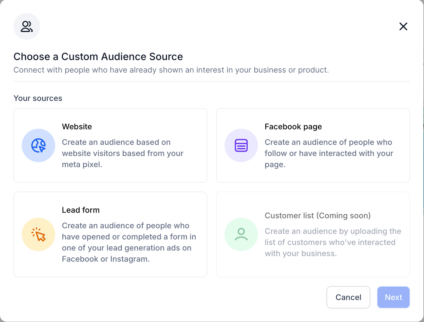 Wenn Sie auf die Schaltfläche „Create a Custom Audience“ klicken, öffnet sich ein Modal-Dialog, der es den Benutzern ermöglicht, eine Custom Audience Quelle auszuwählen, die zur Erstellung der Custom Audience verwendet wird, abhängig von der gewählten Quelle.