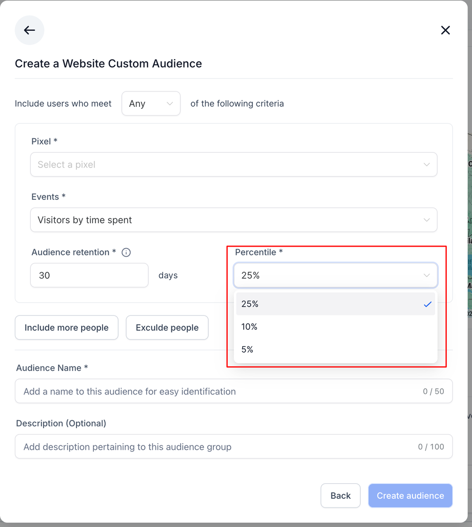 Beispiel zur Verwendung von Perzentilen: Wenn ich 10 % auswähle, bedeutet dies, dass die Audience, die für die Berücksichtigung verwendet wird, die Besucher umfasst, die zu den 10 % der am meisten verbrachten Zeit auf Ihrer Website gehören.