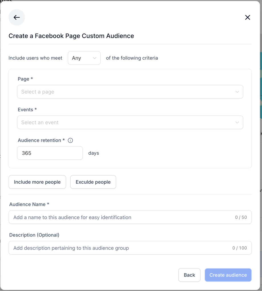 Durch Auswahl von „Facebook Page“ als Custom Audience-Quelle im ersten Schritt-Dialog können Benutzer eine Audience aus Personen erstellen, die Ihre Seite folgen oder mit ihr interagiert haben, und im zweiten Schritt die spezifischen Eigenschaften der Audience definieren.