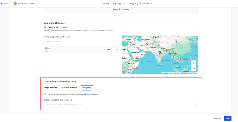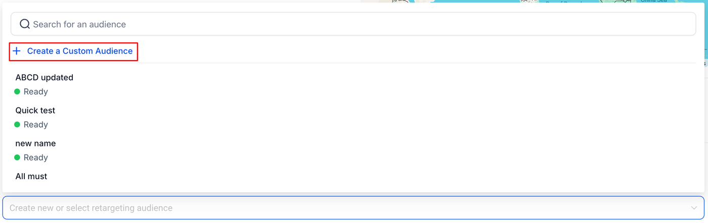 Unter dem Reiter Retargeting: Wenn Sie auf das Dropdown-Menü „Create new or select retargeting audience“ klicken, ist die erste Option in der Liste „Create a Custom Audience“.