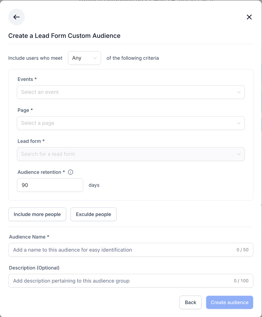 Lead Form: Basierend auf der ausgewählten Seite werden alle Lead Forms der Seite im Dropdown angezeigt. Wählen Sie das Formular aus, das für die Audience-Erstellung berücksichtigt werden soll.