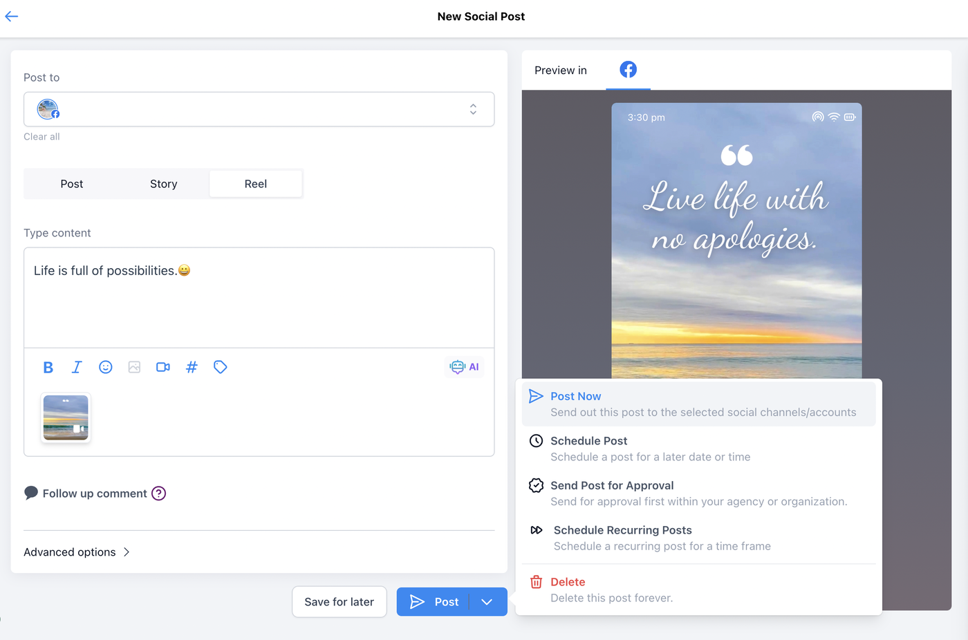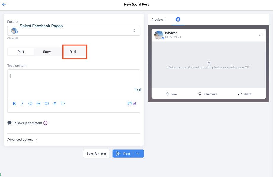 Beim Erstellen eines neuen Beitrags wähle die Facebook-Seite aus, auf der das Reel gepostet werden soll.