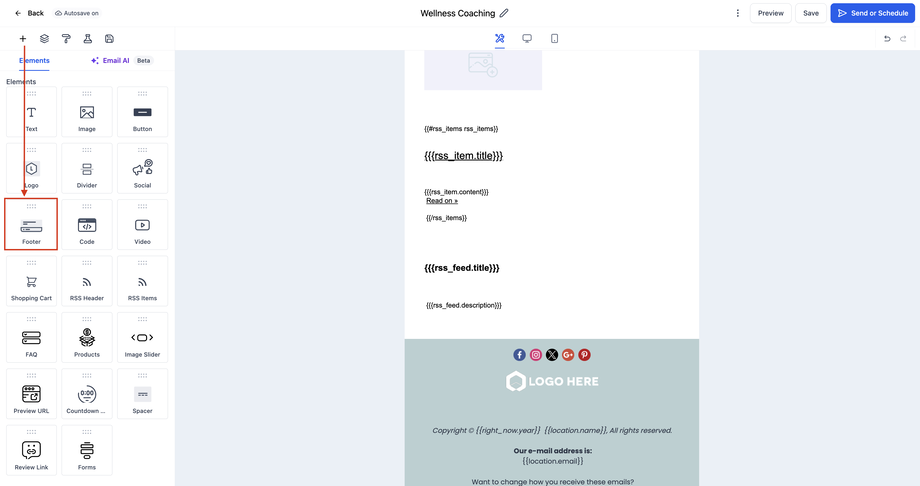 Ziehen Sie das Footer Element an das Ende Ihrer E-Mail.