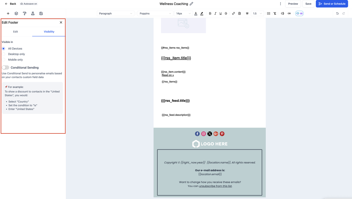 FDas Footer Element ermöglicht es, professionelle und konsistente E-Mail-Footer zu erstellen. Hier können wichtige Informationen wie Kontaktdetails, Abmeldelinks, Social-Media-Icons und rechtliche Hinweise hinterlegt werden.