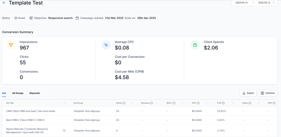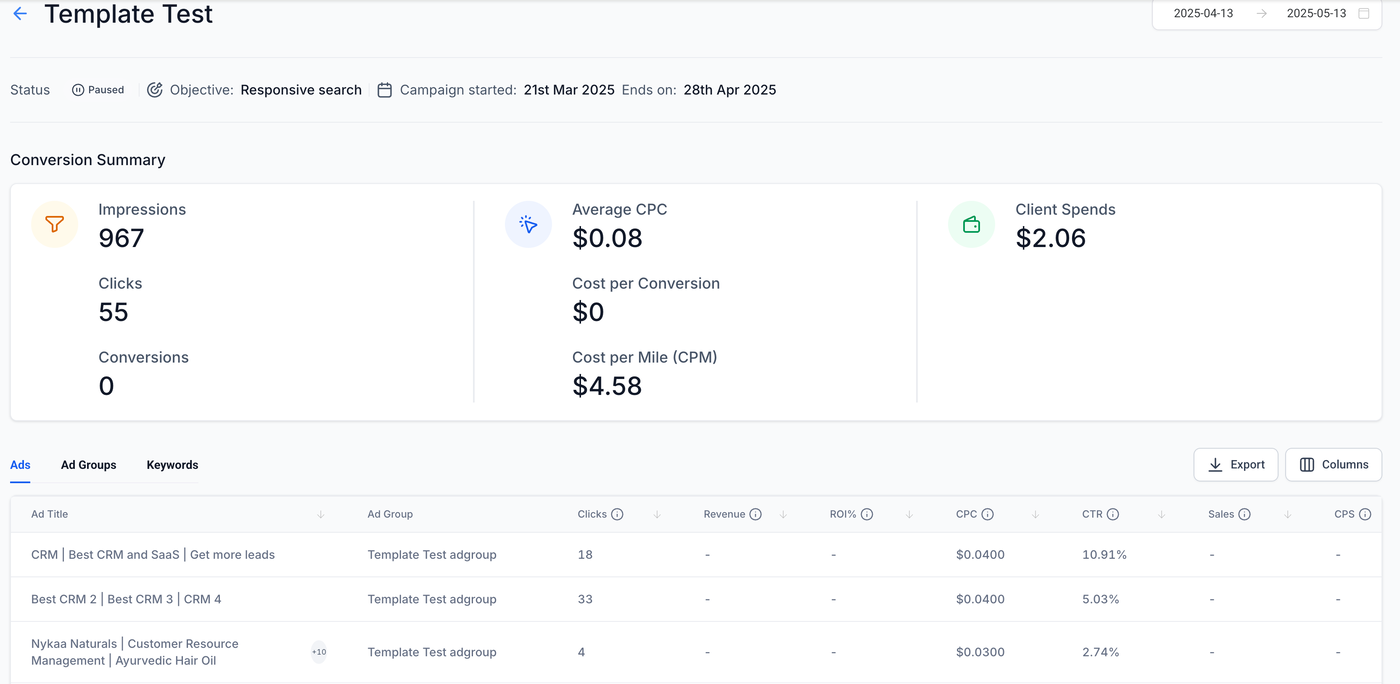 Spalten anpassen oder exportieren, um die wichtigsten Kennzahlen hervorzuheben.