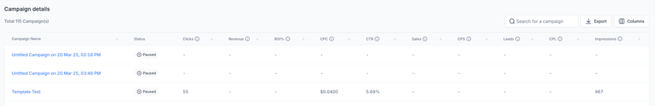 Scrolle zur Kampagnenübersichtstabelle, um alle Kampagnen zu analysieren: