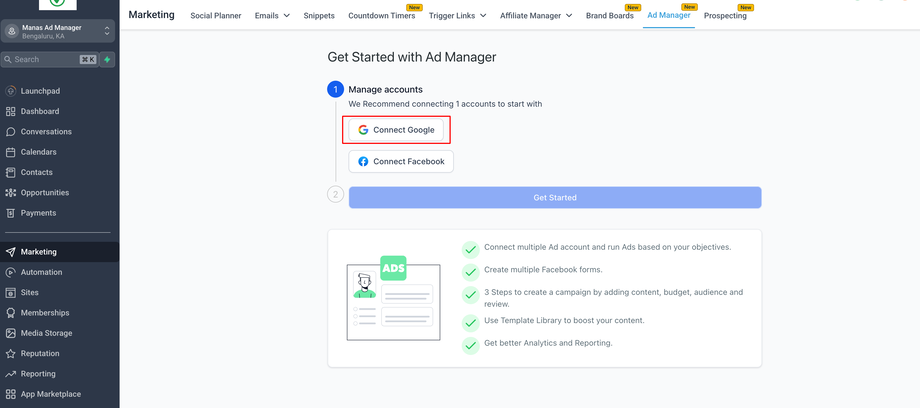 Nachdem der Benutzer den Ad Manager abonniert hat, ist das Verbinden von Google mit dem Ad Manager ein weiterer wesentlicher Schritt, bevor die Kampagnenerstellung beginnen kann.
