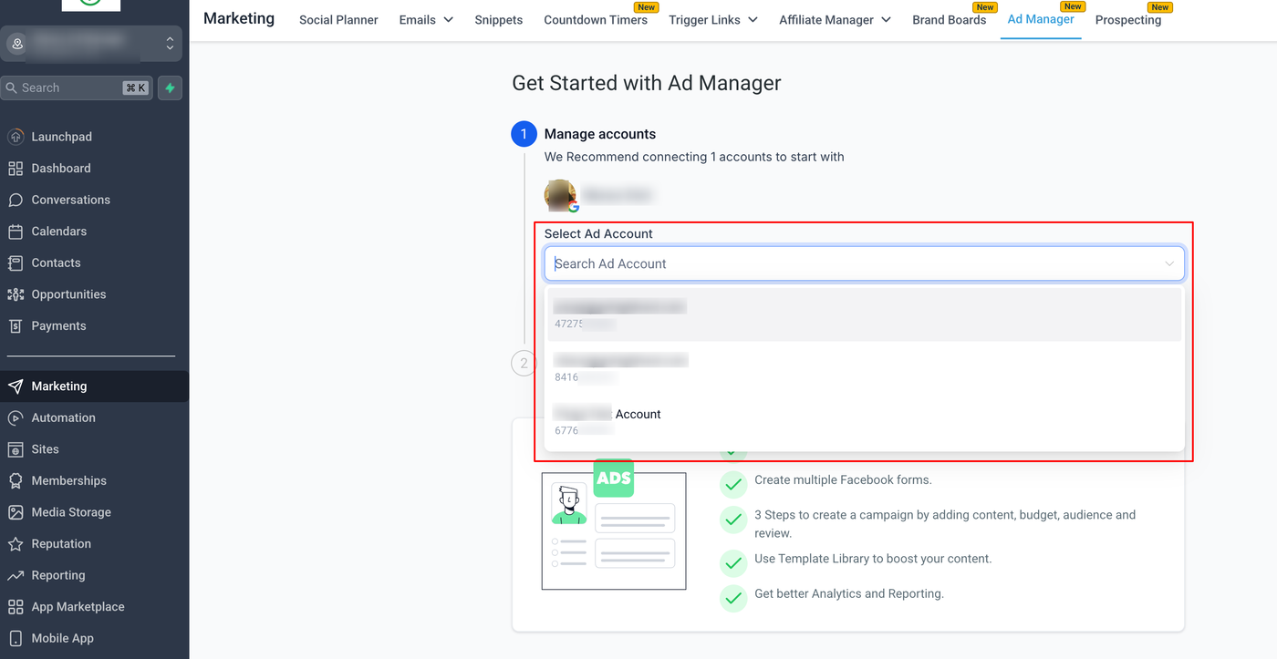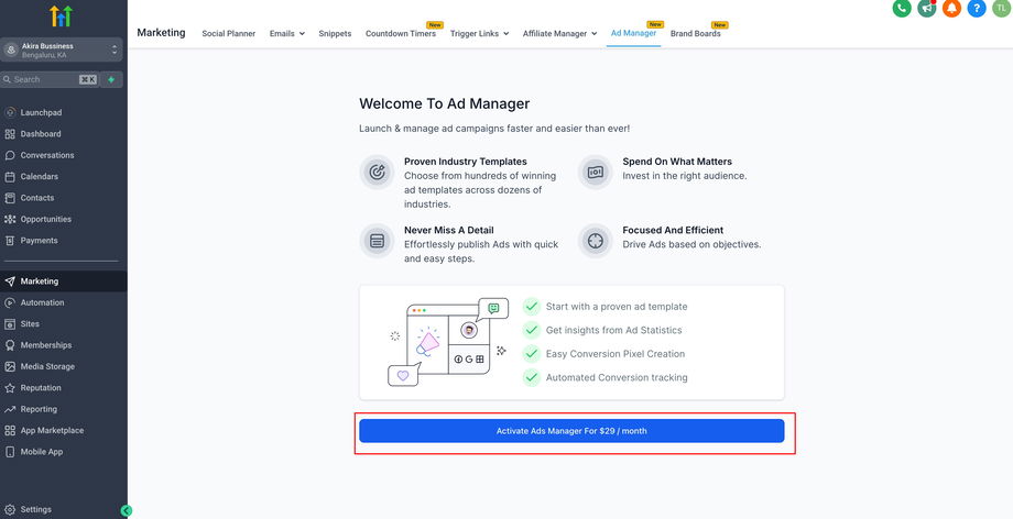 Sobald dies erledigt ist, kann der Benutzer den Ad Manager bei der Agentur abonnieren, indem er auf die Schaltfläche „Activate Ad Manager“ klickt, die sich im jeweiligen Sub-Account ➝ Marketing ➝ Ad Manager-Tab befindet.