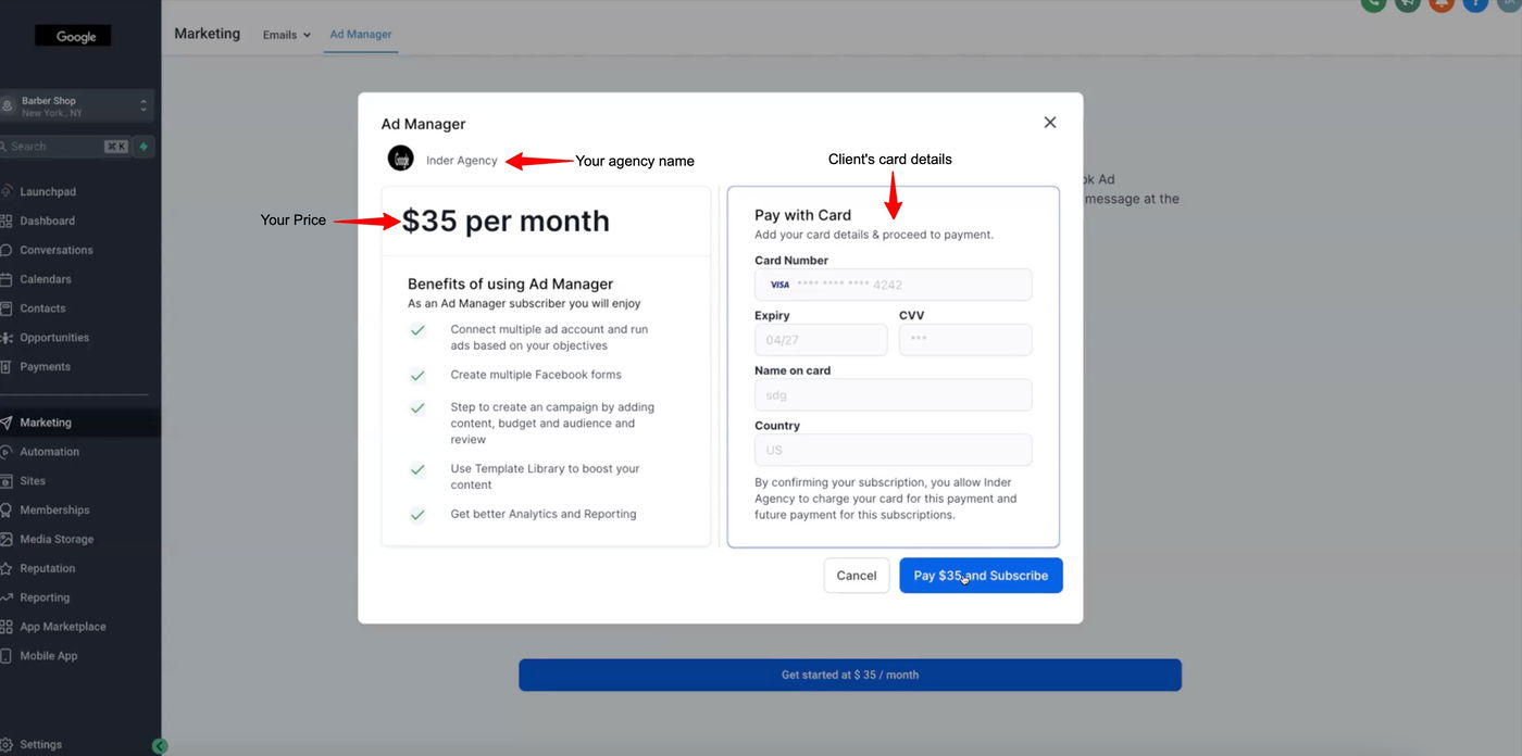 Hinweis: Dies ist ein monatlicher Abonnementbetrag, den die Agentur den Sub-Accounts für die Nutzung des Ad Managers und das Veröffentlichen unbegrenzter Kampagnen berechnet. Die Zahlung für die Kampagne selbst wird von der im Meta-Werbekonto hinterlegten Karte abgebucht, die vom Benutzer hinzugefügt wurde, sobald die Kampagne von der Veröffentlichungsplattform genehmigt wurde.