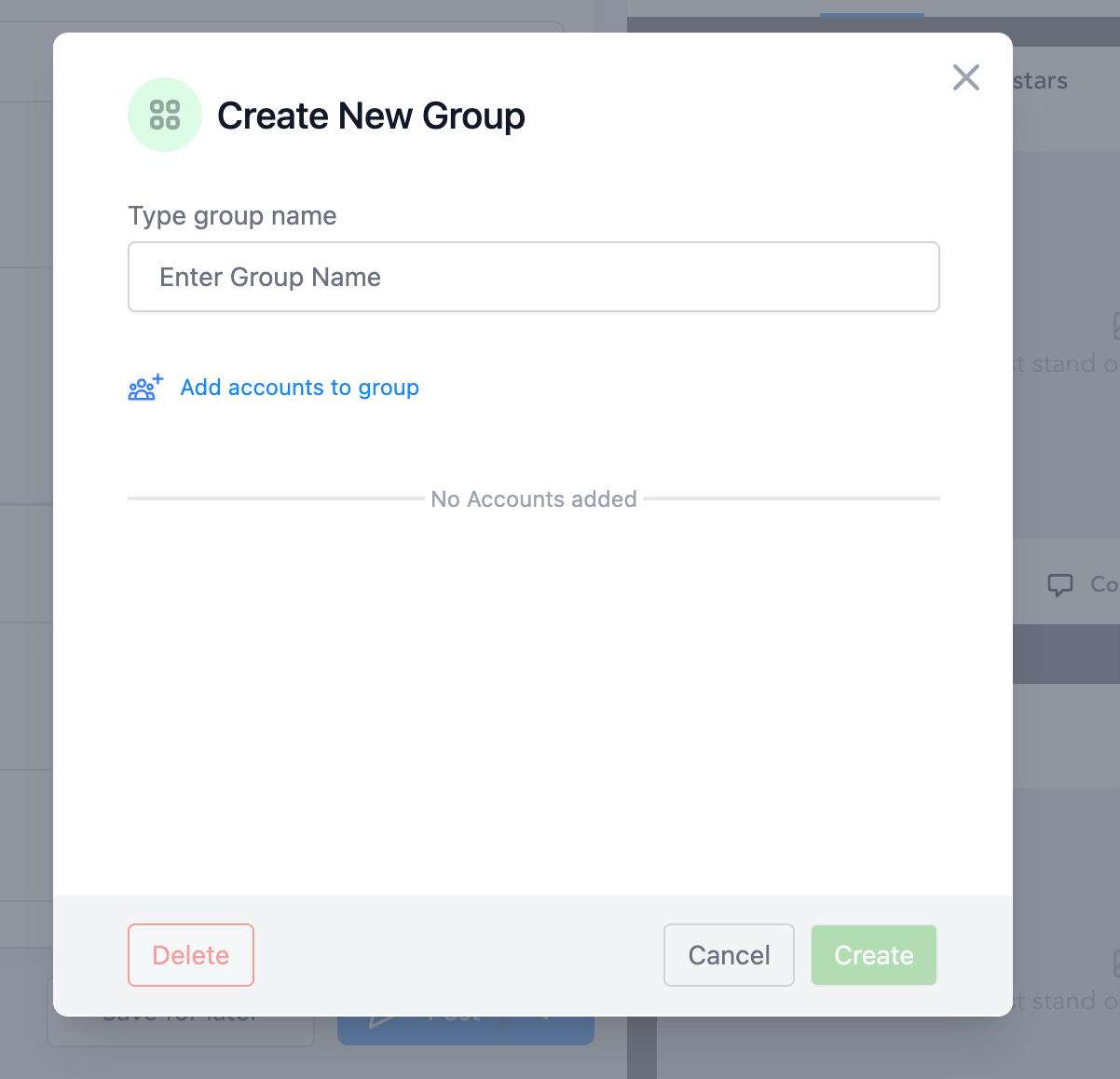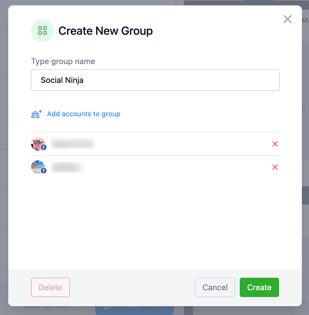 Sie kann von der Übersichtsseite des Social Planners erstellt werden, beim Erstellen eines neuen Beitrags oder in den Einstellungen des Social Planners, wo der Benutzer die Social-Accounts innerhalb der Gruppe verwalten kann.