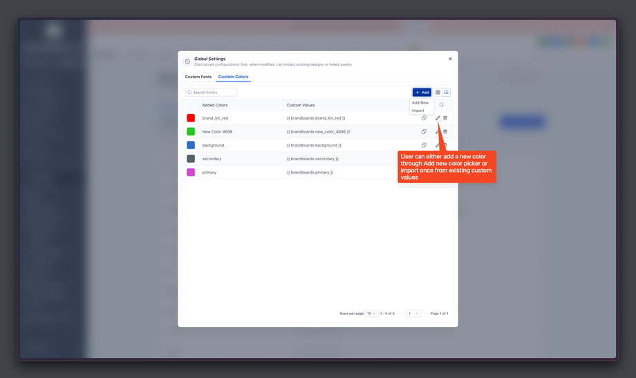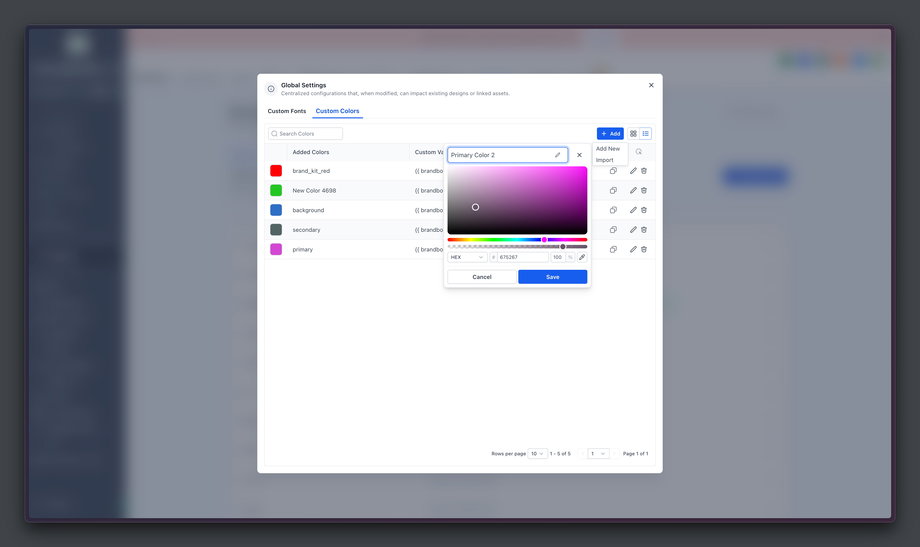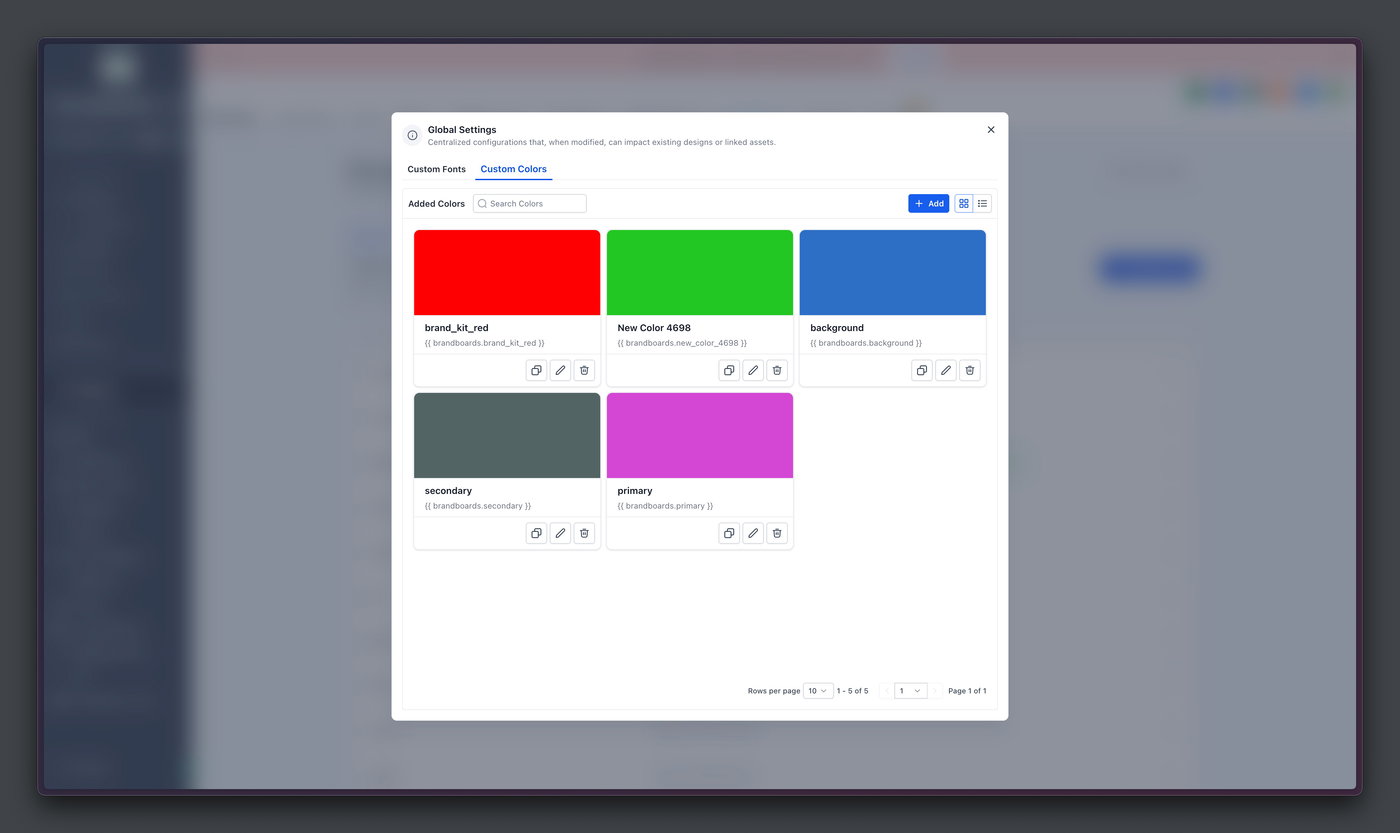 Global Custom Colors sind Markenfarben, die in den Global Settings unter Brand Boards gespeichert werden.