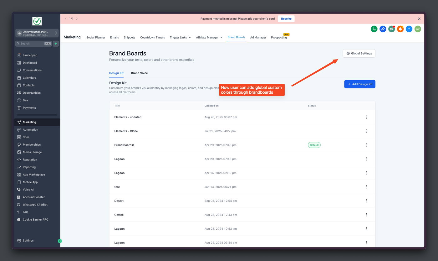 Marketing → Brand Boards → Global Settings