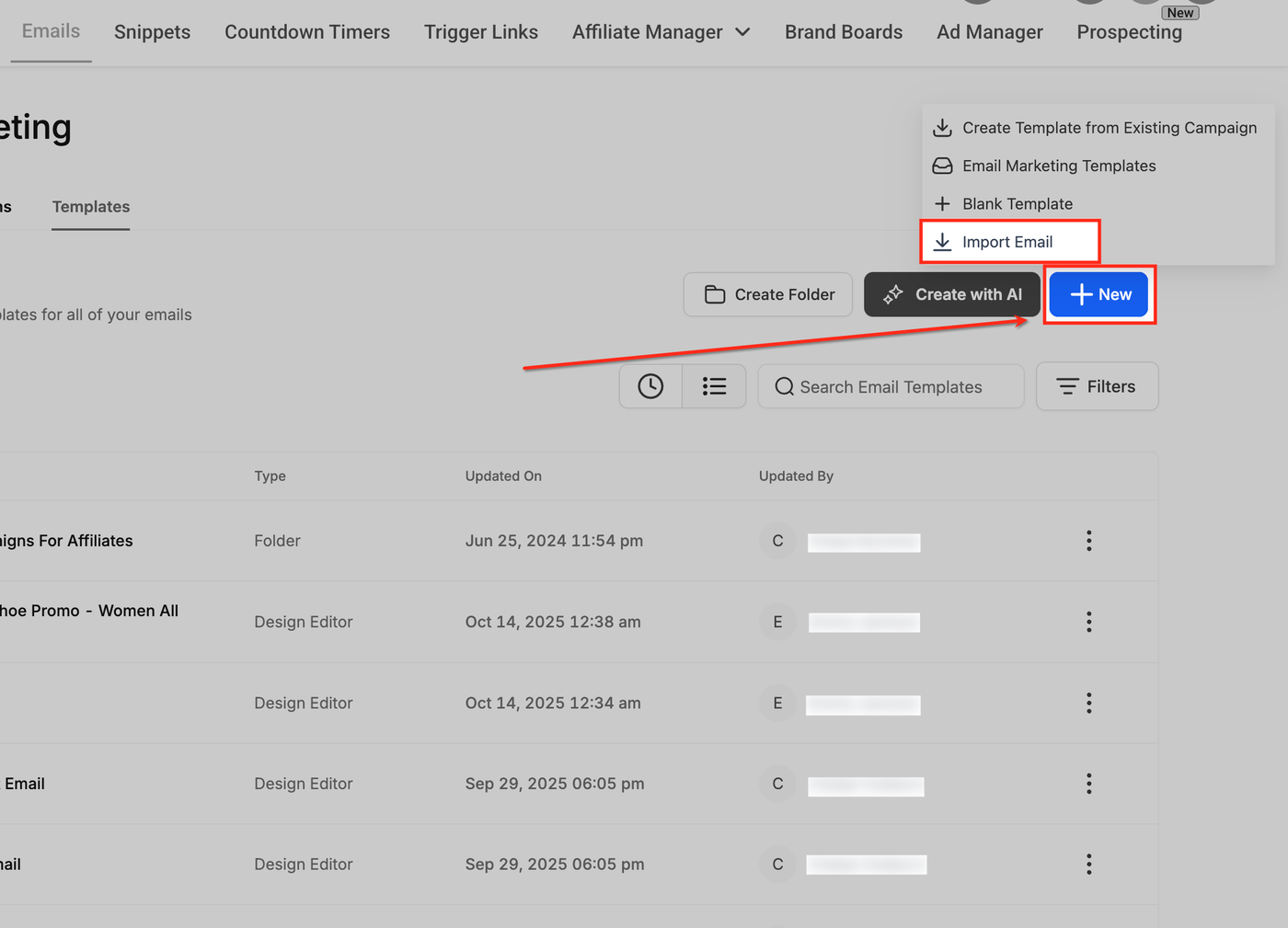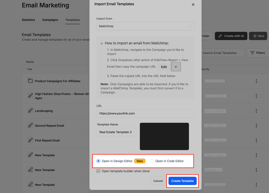 Dies ermöglicht den Import von Vorlagen von externen Anbietern wie Mailchimp.