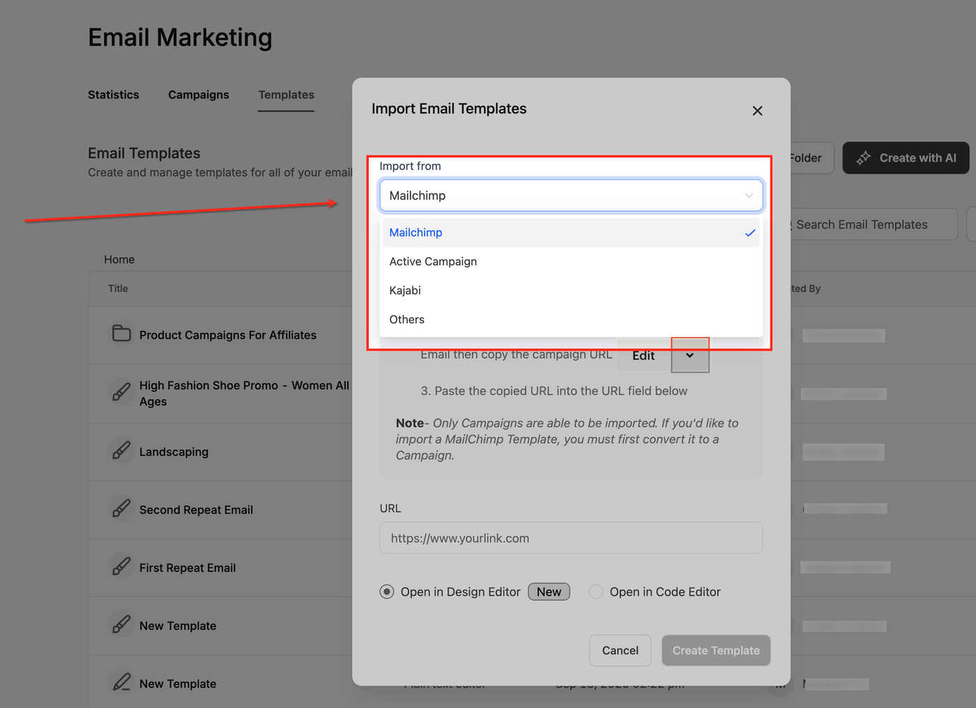 Im Popup Import Email Templates wähle unter Import from die Option Mailchimp.