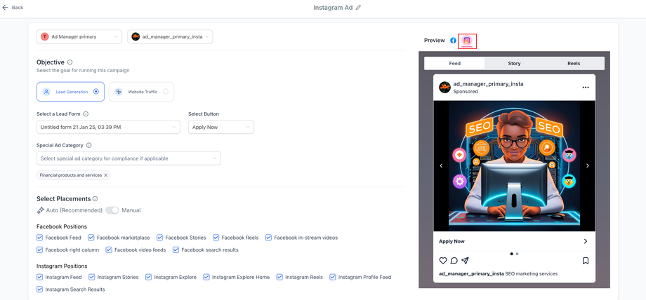 Eine Vorschau, wie Ihre Anzeige auf Instagram aussehen wird, kann im Vorschaufenster durch Auswahl des Instagram-Tabs angezeigt werden.