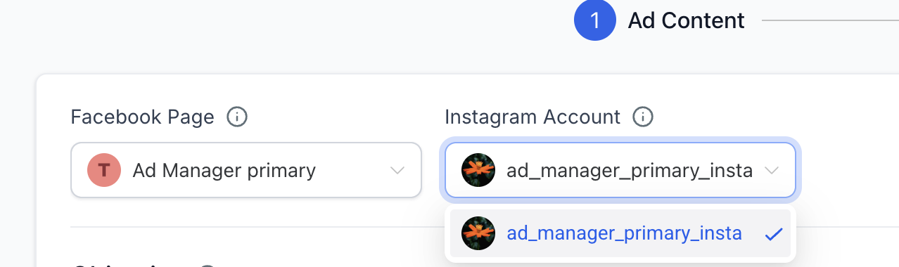 Wählen Sie das Instagram-Konto, das Sie zur Veröffentlichung der Anzeige verwenden möchten. Es gibt zwei Fälle: