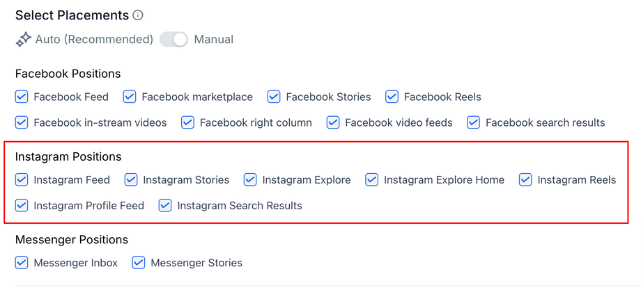 Alle Instagram-Platzierungen werden im Abschnitt Manuelle Platzierung angezeigt, und der Nutzer kann die gewünschten Platzierungen auswählen. Wenn Automatische Platzierungen aktiviert sind, werden alle Instagram-Platzierungen ausgewählt.