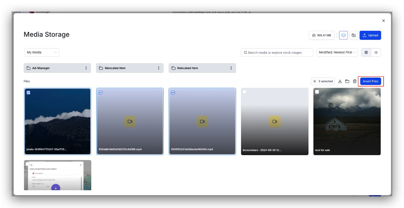 Im Medienbereich kannst du mehrere Dateien gleichzeitig auswählen und mit „Insert Files“ einfügen.