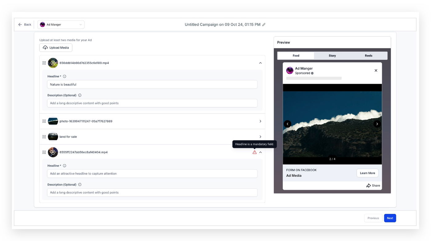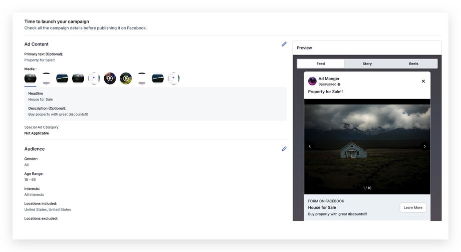 Im Preview-Bereich siehst du, wie die Anzeige mit den ausgewählten Medien aussehen wird.Unter „Review and Publish“ werden alle verwendeten Medien im Bereich Ad Content > Media angezeigt.