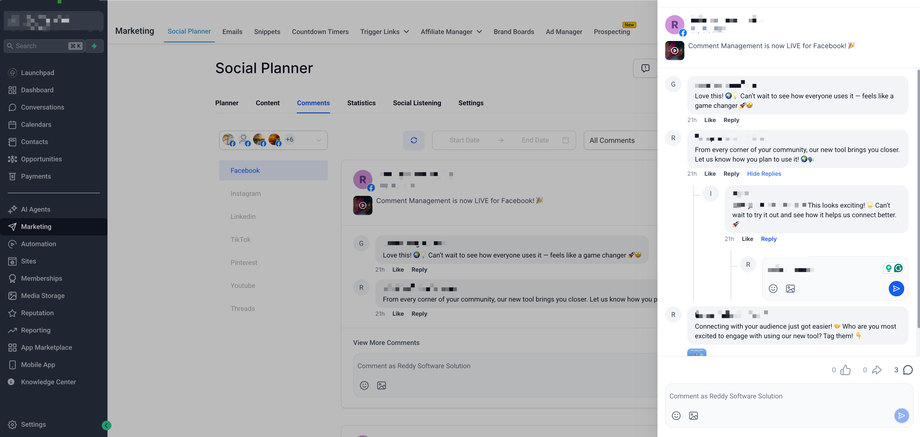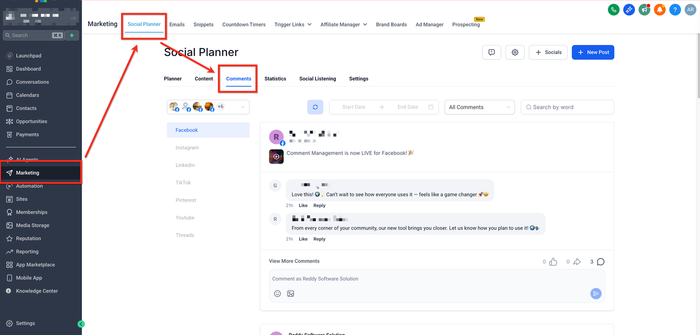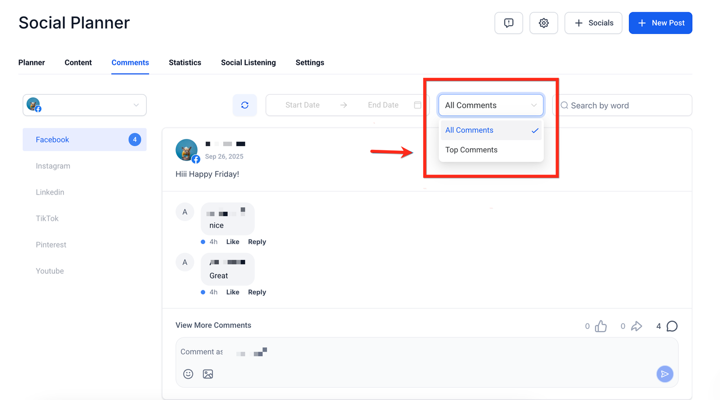 Die Kommentarverwaltung im Social Planner ermöglicht es dir, Kommentare zu deinen Beiträgen einzusehen und zu beantworten – alles in einem Dashboard.