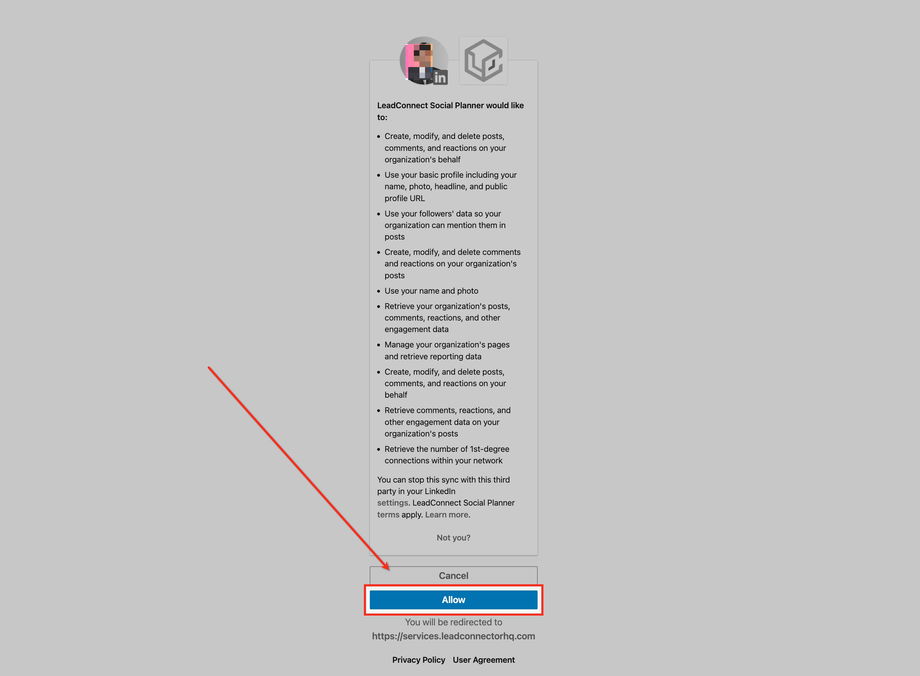 LinkedIn bittet um Autorisierung des Zugriffs über LeadConnector. Klicken Sie auf „Allow“.
