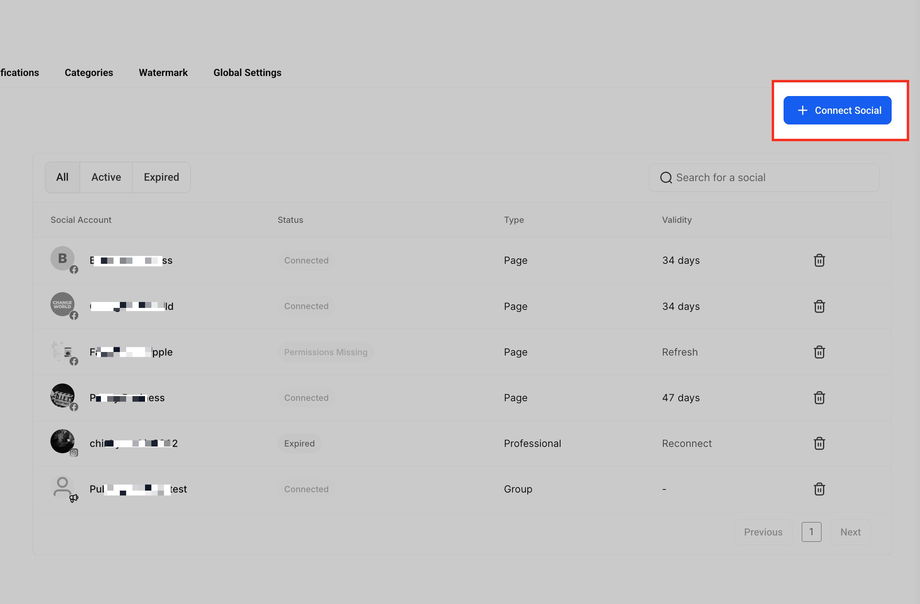 A: Wenn das Token abläuft, wird im Tab Social Accounts „Reconnect“ angezeigt. Einfach darauf klicken und erneut autorisieren.