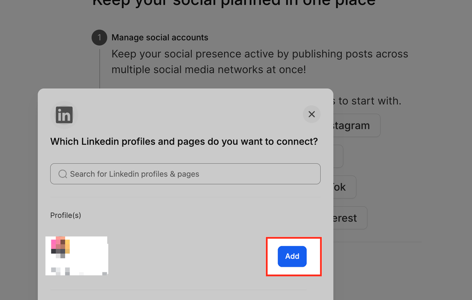 Nach der Autorisierung wählen Sie das LinkedIn-Profil oder die Unternehmensseite aus, die Sie verbinden möchten, und klicken auf „Add“.