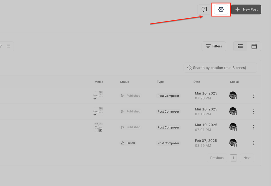 Klicken Sie auf das Zahnrad-Symbol oben rechts, um die Einstellungen des Social Planners zu öffnen.