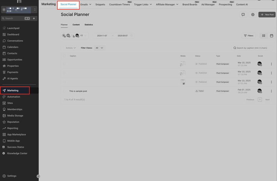 Gehen Sie über die linke Seitenleiste zu Marketing > Social Planner, um Ihre geplanten Inhalte über alle verbundenen Social-Kanäle zu verwalten.