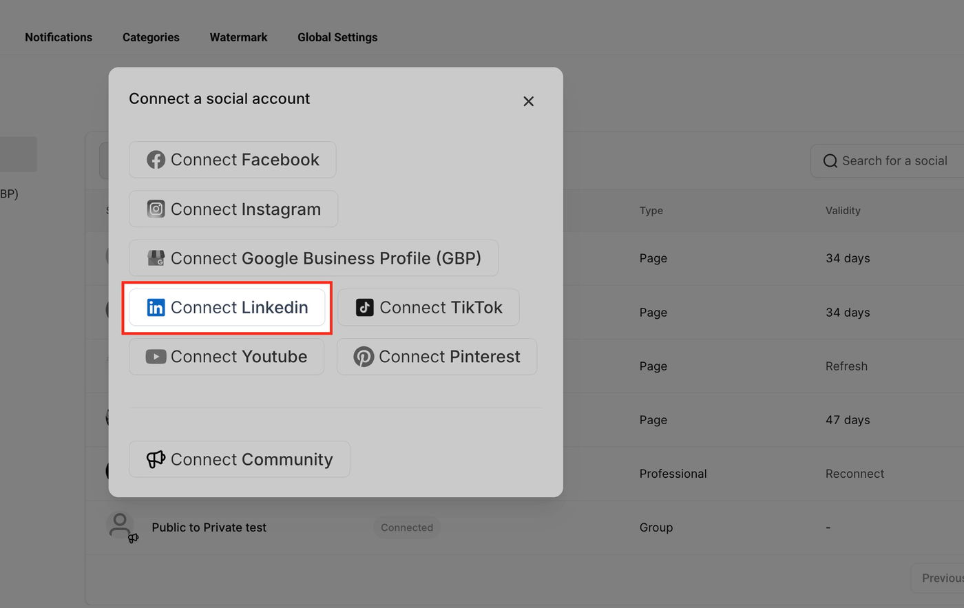 Ein Popup zeigt alle verfügbaren Plattformen an. Klicken Sie auf „Connect LinkedIn“.