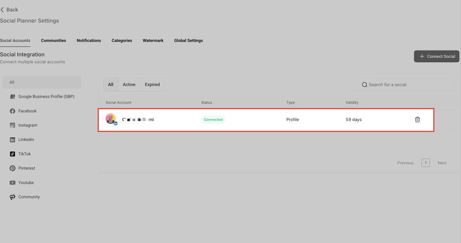 Das Konto wird nun als „Connected“ im Tab Social Accounts angezeigt, inklusive Typ und Token-Gültigkeit.