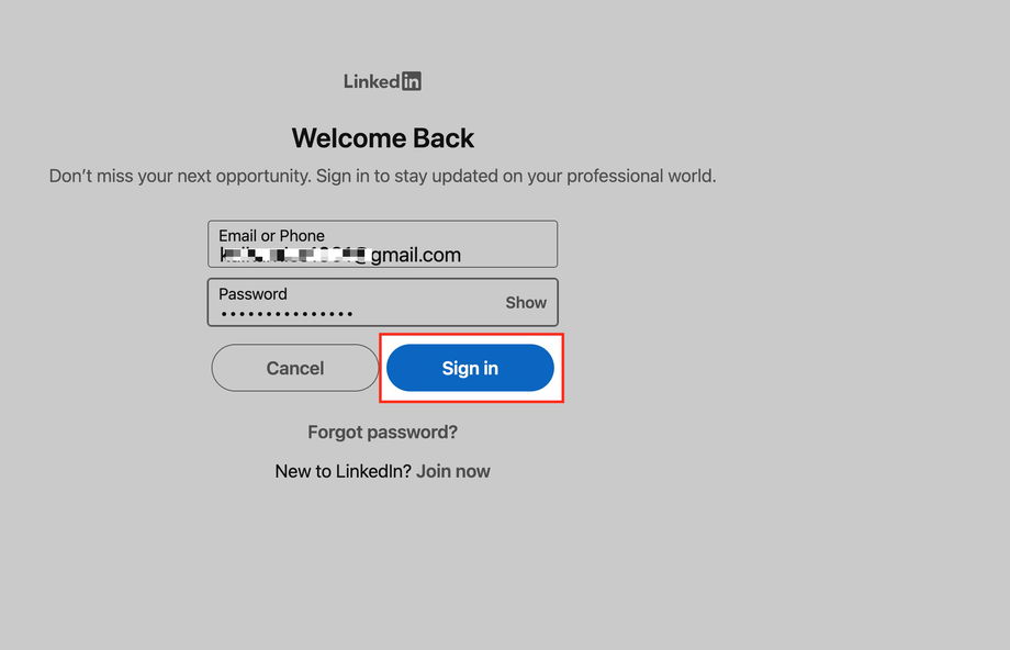 Sie werden zum LinkedIn-Login weitergeleitet. Geben Sie Ihre LinkedIn-Zugangsdaten ein und klicken Sie auf „Sign In“.