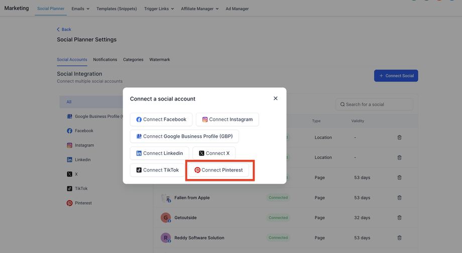 Wähle das Pinterest-Konto zusammen mit deinen anderen Social-Media-Konten aus.