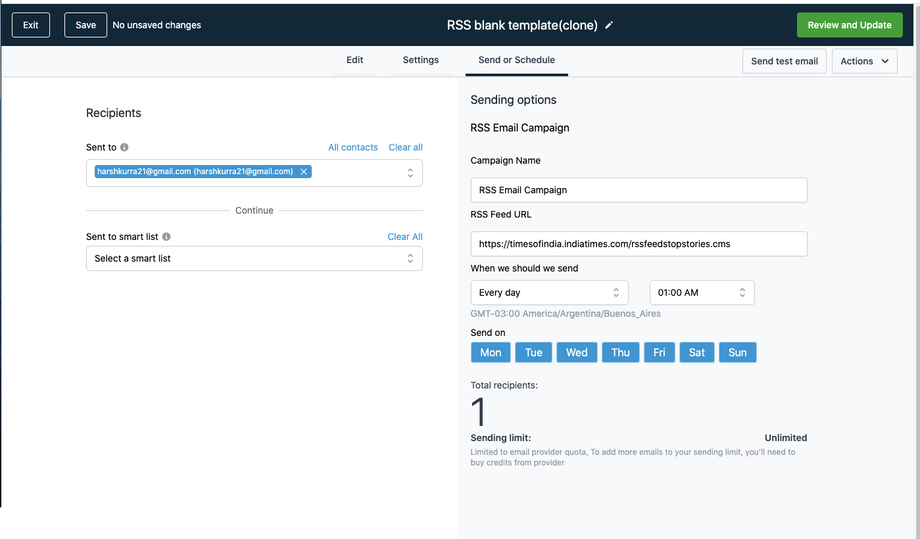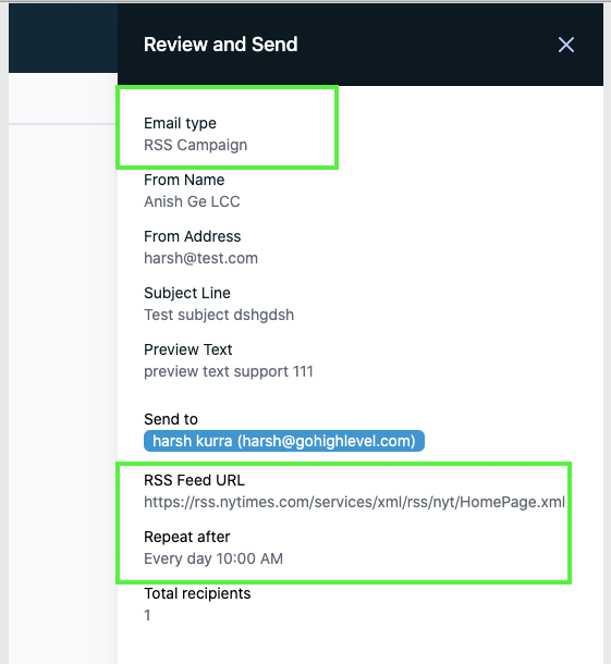 Im Review-Panel werden Email-Typ, RSS-Feed-URL und Wiederholungsintervall angezeigt