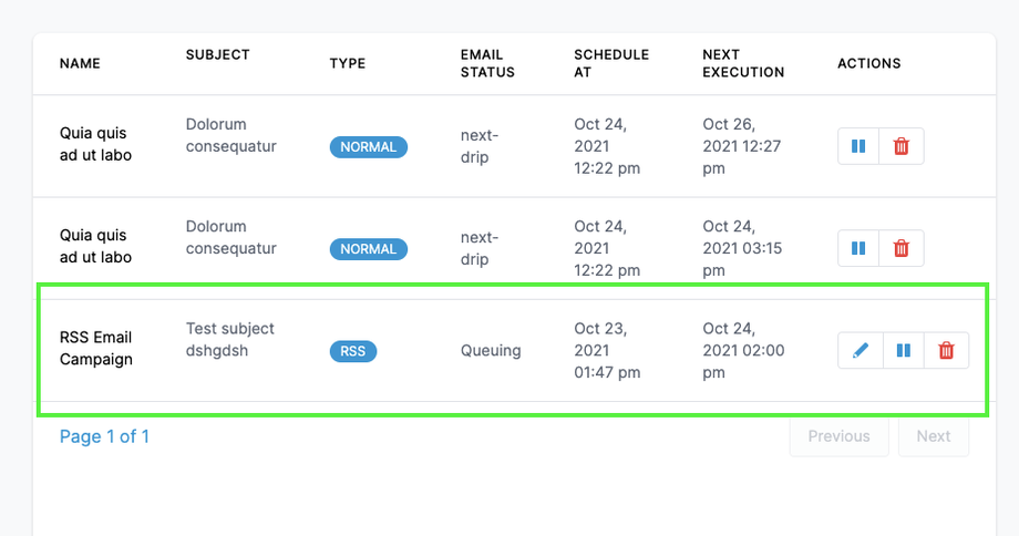 Geplante RSS-Kampagnen erscheinen im Tab „Scheduled“ als Typ „RSS“