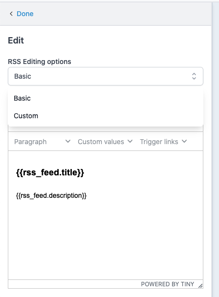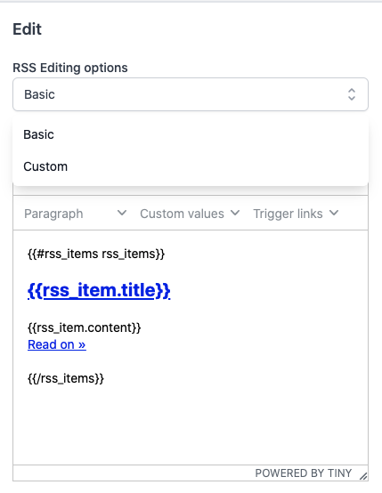 {{#rss_items rss_items}}<h2 class="mc-toc-title"><a href="{{rss_item.url}}" target="_blank">{{rss_item.title}}</a></h2>{{rss_item.content}}<br /><a href="{{rss_item.url}}" target="_blank">Read on »</a><br /><br />{{/rss_items}}Custom: Editierbarer Text: