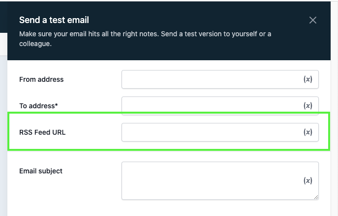 Beim Testen mit „Send Test Email“ muss die RSS-Feed-URL angegeben werden. Ohne diese werden alle RSS-basierten Variablen leer ersetzt.