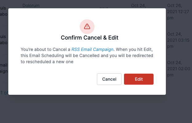 Edit: Klick auf Stift-Symbol, bestätigt Abbruch der aktuellen Planung und öffnet Builder mit vorausgefüllten RSS-Optionen