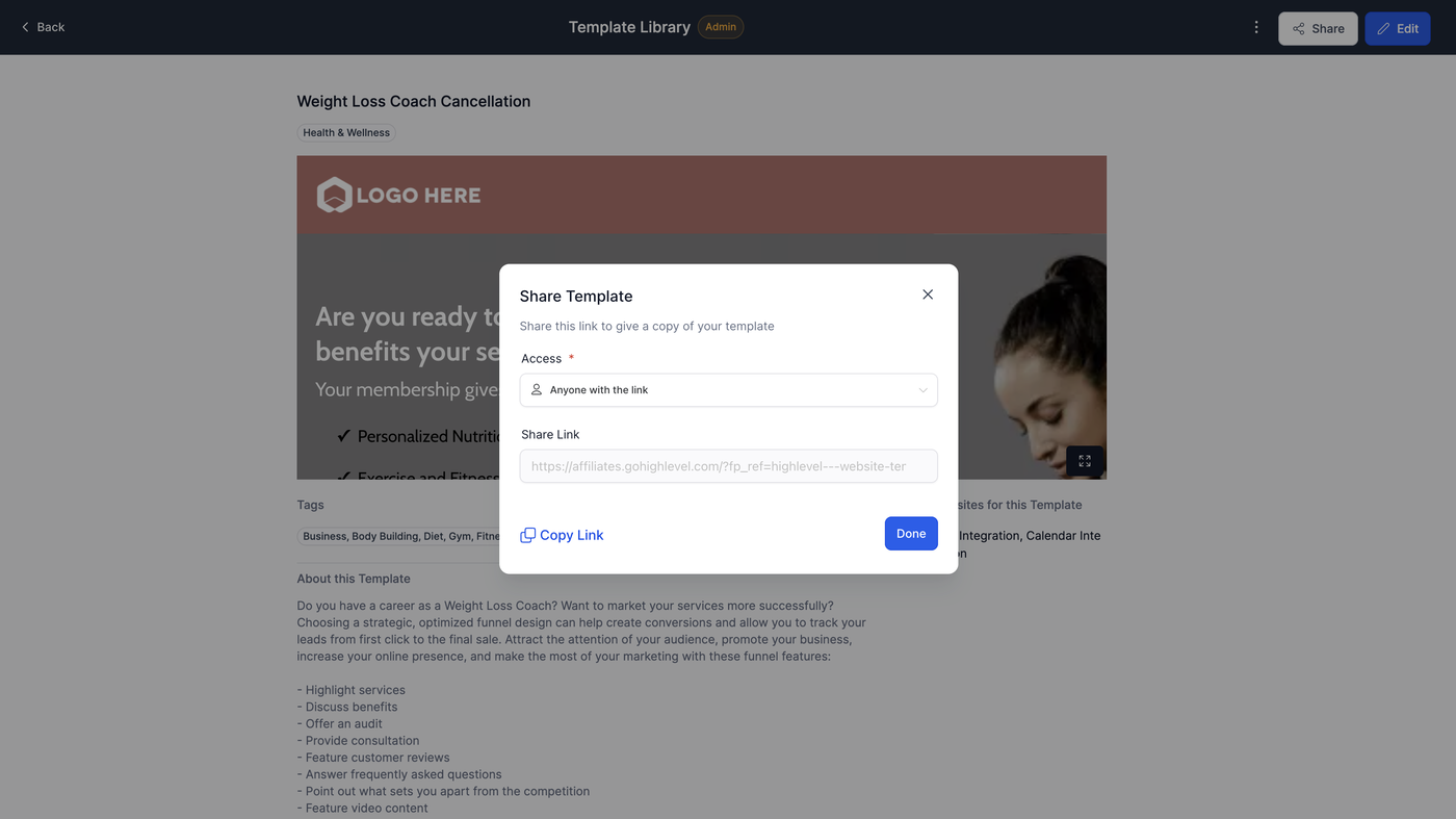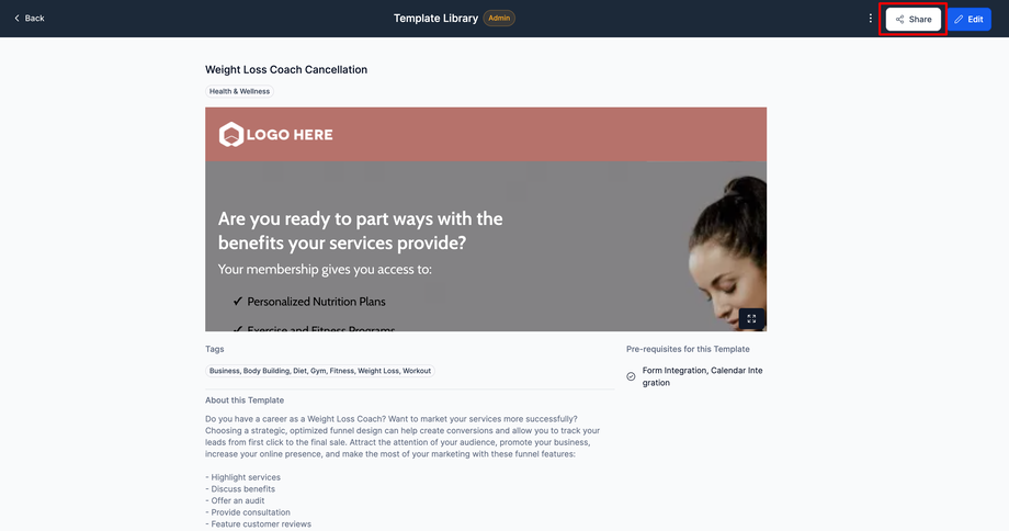 Klicken Sie auf die Option „Share“, um einen einzigartigen Link zu erstellen, der mit dem ausgewählten Template verknüpft ist.